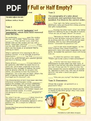 Challenging the bpd distorted outlook: Your ss can do a personality quiz to evaluate which type of person they are. Are you an optimist or a pessimist? A class on optimism and pessimism. The following esl / efl resources are available for optimism and pessimism: And, if you need further support on . Here are extracts from some of her diary entires:. Adelia had spent over a year planning an expedition across an inhospitable desert region. Before you begin the exercise, take a look at the difference between optimistic and pessimistic thought patterns. Now, let's see which thought patterns . Use the abcde model and the exercises mentioned above to challenge and change your pessimistic thoughts. Here's two role plays, both revolving around money and work in two different ways. It's just an idea for your lesson, not a worksheet.